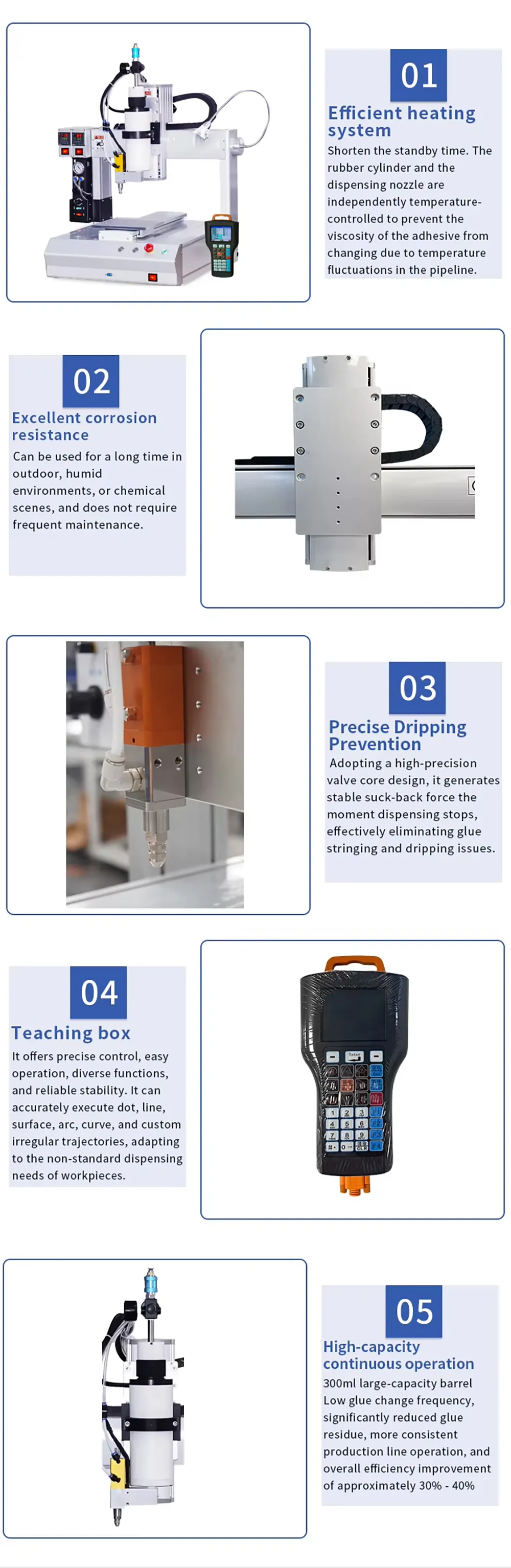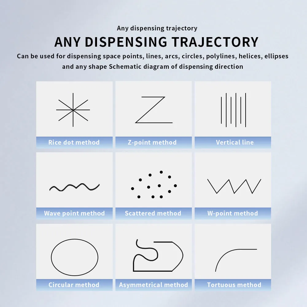 9.The 3-axis glue dispenser machine compatible with various fluids and adhesives such as hot melt glue, epoxy glue,SMT glue, AB glue, PVC glue , anaerobic adhesive, brazing paste, instant adhesive, filtration fluids, perfusion adhesives, resins, lubricating oils, clear coatings, water-based flux, grease, marking adhesives, medical-grade adhesives, paints, RTV silicone sealants, solder paste, silicone oil, solvents, thermal paste, UV-curing adhesives, and other.