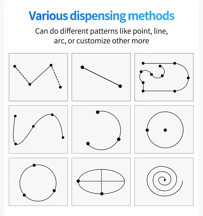 The SMT glue dispenser machine use Three-Axis Control System,it has the painting point, straight line, multi line segment, three-dimensional arc (spatial arc), round, rectangular, runway, coating,automatic corner rounding, irregular 3D spline curve and other graphical elements; rich handmade teaching function and graphical preview function. Designed for high-precision adhesive application in SMT, PCB, LED, and electronic assembly processes.
