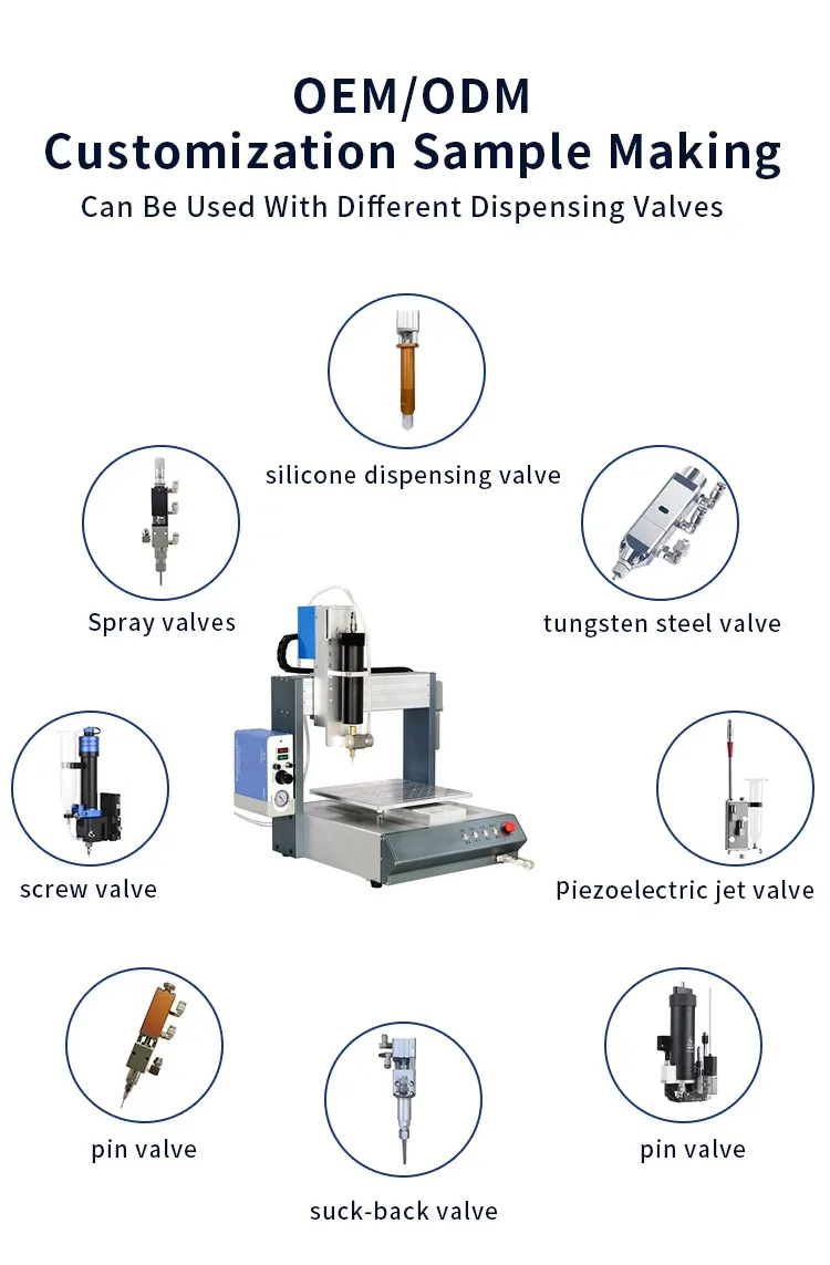 8.The Three-axis SMT glue dispenser machine is suitable for fluid glue, such as UV, AB glue, COB (black glue), white glue, EMI conductive Glue, silicon, epoxy resin, instant glue, silver glue, red glue, paste, thermal grease, welding control paste,Transparent paint, screw fixative and so on.